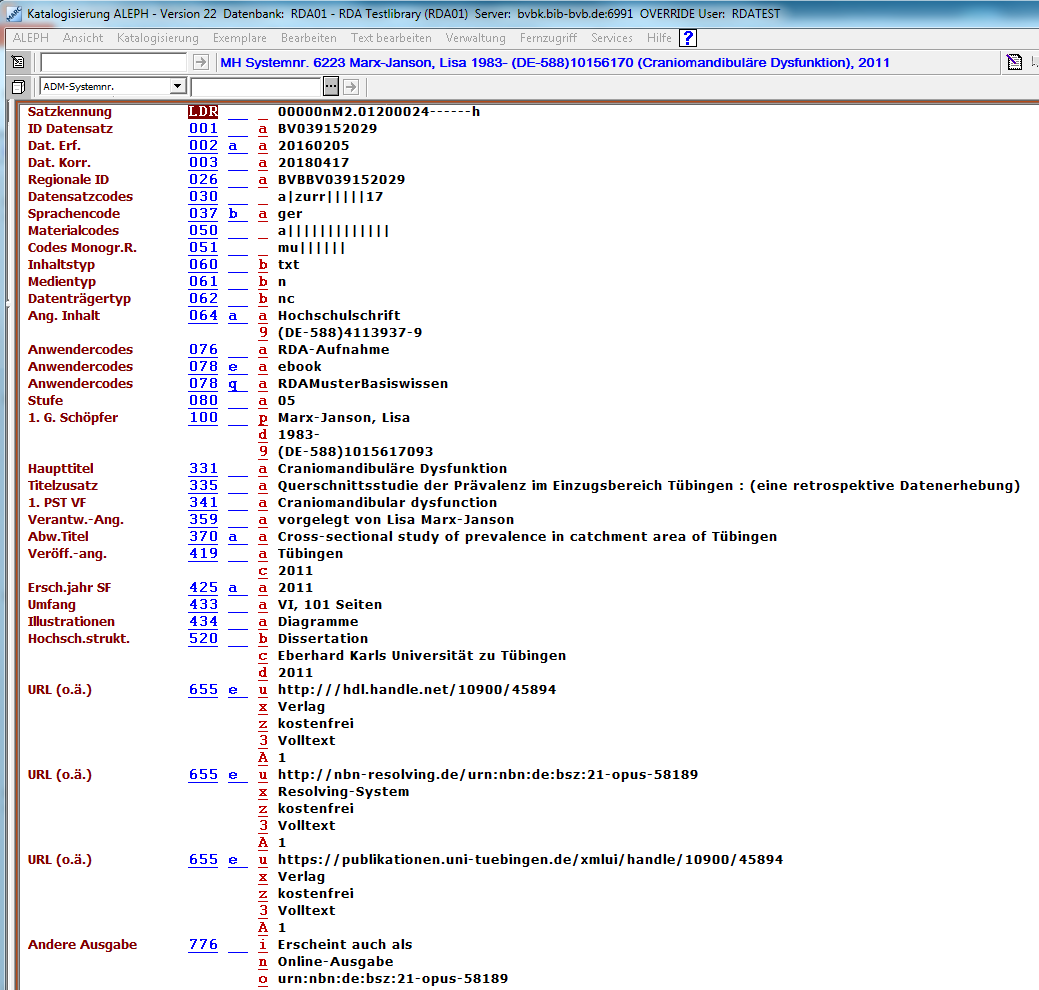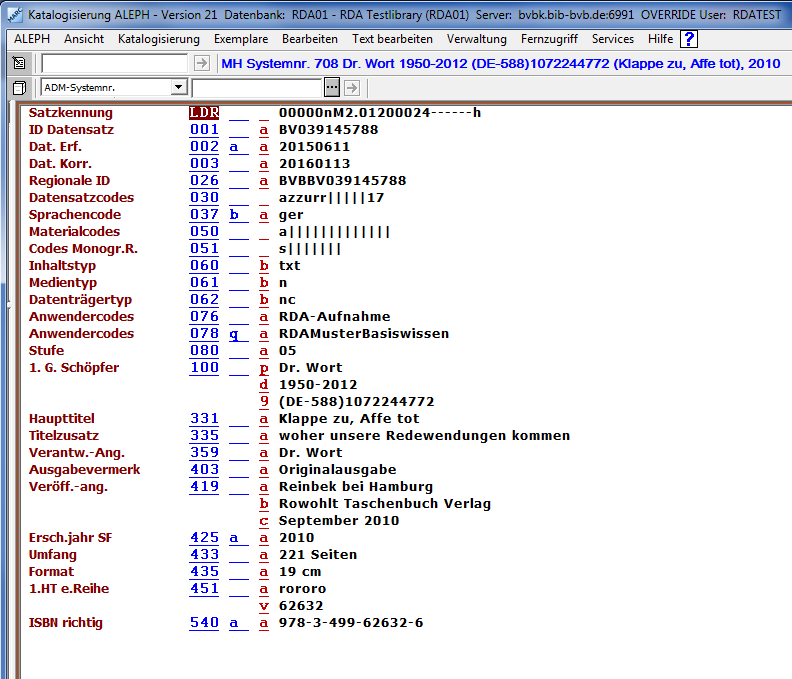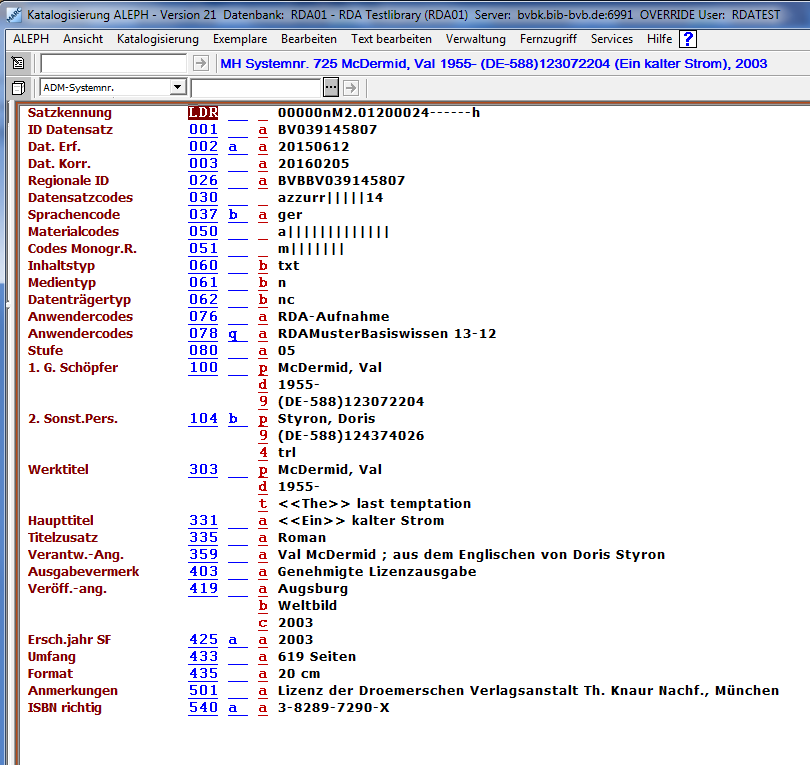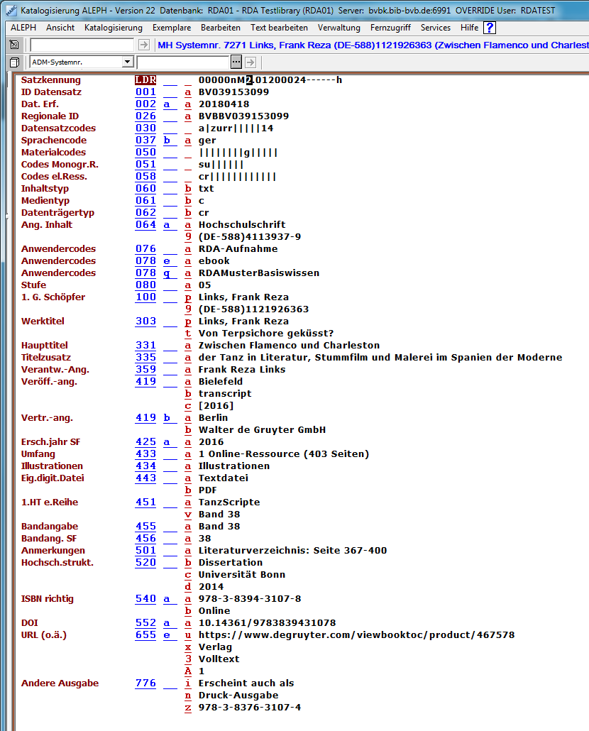 Musterlösung, die der Beispiellösung im Lehrbuch "Basiswissen RDA" entspricht: