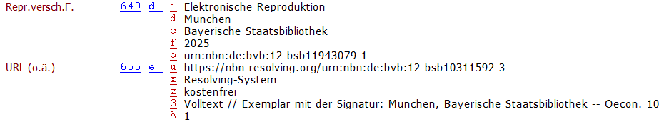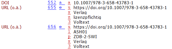 In angereicherten Beschreibungen sind die zugrundeliegenden Beschreibungen der Druckausgaben typischerweise um das Feld 078e (Belegung "ebook") und das Feld 655e (Link/URL ggf. mit zusätzlichen Angaben in Unterfeldern) ergänzt. 776 $i ist mit der Beziehungskennzeichnung "Erscheint auch als" und 776 $n mit "Online-Ausgabe" zu belegen. Ggf. ist auch ein Persistent Identifier, z.B. URN, in Feld 776 $o zu ergänzen.