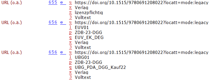 Für (evtl. auch einzeln) lizenzierte E-Books in Aggregatorprodukten ist eine ggf. vorhandene providerneutrale Aufnahme für das E-Book beim Verlag / einem anderen Aggregator zu nutzen. Dazu wird in der vorhandenen Aufnahme in einem weiteren Feld 656e inkl. Unterfeldern der Link für die eigene Bibliothek ergänzt.